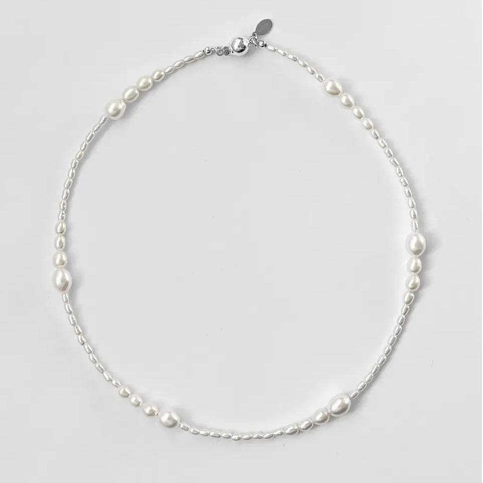 Our best-selling Avery Necklace redesigned in rice pearls. This collar length necklace is strung with glossy freshwater pearls, perfect for layering. Made in our Vancouver studio.